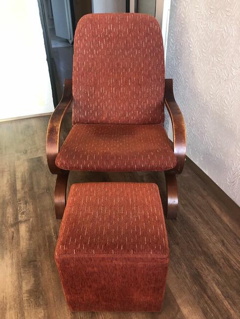 Wygodny fotel z podnóżkiem (pufą) w kolorze rdzawym. Stan dobry. Nadaje się do salonu lub sypialni, aby zapewnić ...