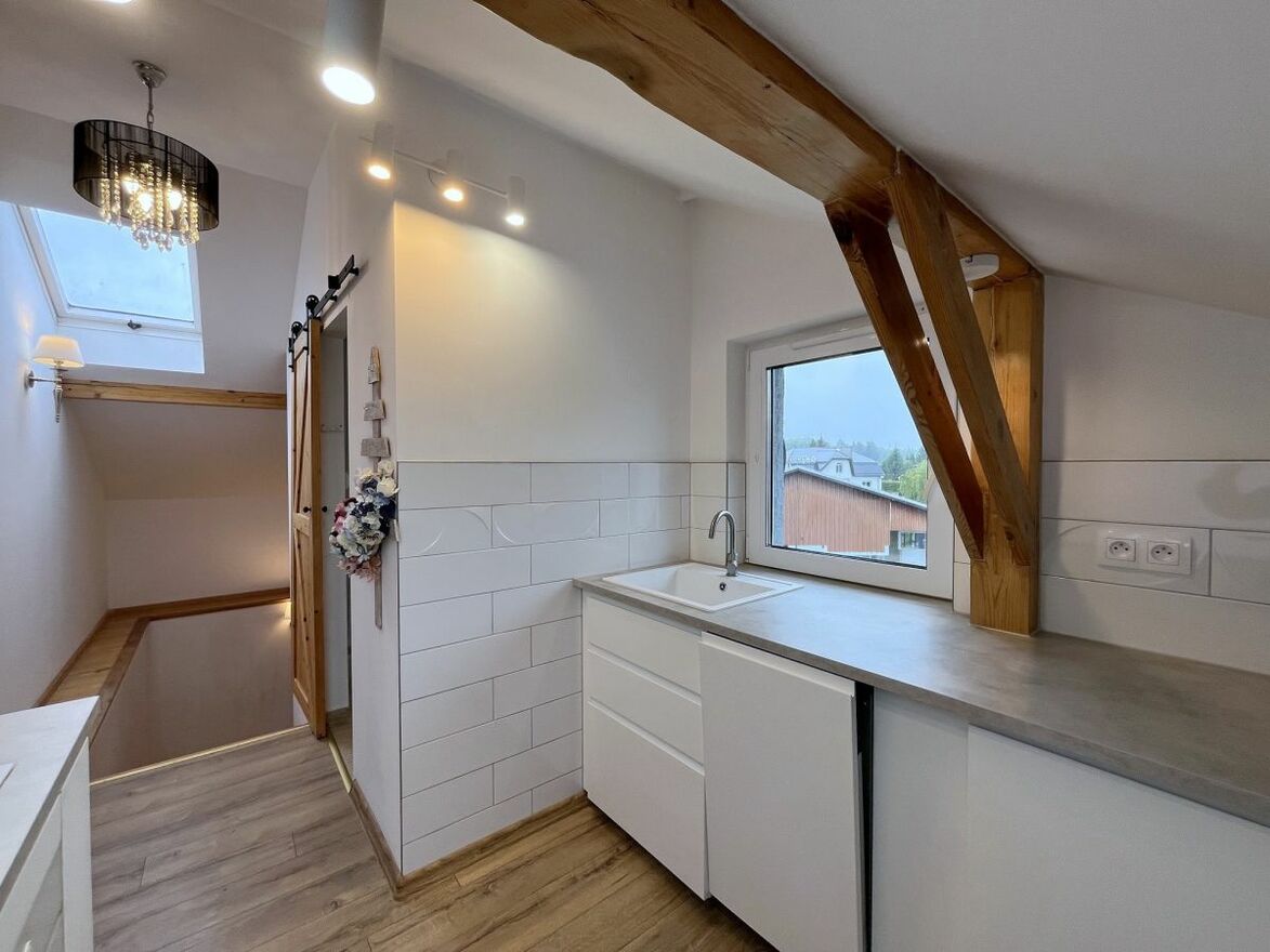 Kuchnia wyposażona w sprzęt AGD (lodówka, kuchenka, piekarnik, okap)