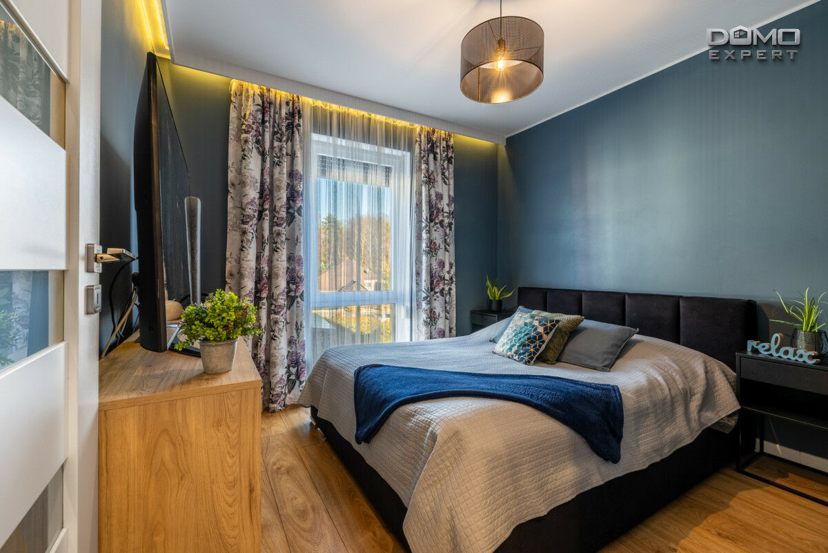 Wnętrze mieszkania zostało wykończone z dużą dbałością o detale, co widać już w otwartej strefie dziennej. Przestronny salon połączony z jadalnią i stylową kuchnią tworzy harmonijną całość, w której zastosowano spójną kolorystykę, wysokiej jakości materiały oraz nowoczesne oświetlenie. Duże okna zapewniają świetne doświetlenie wnętrza i przyjazną atmosferę przez cały dzień.