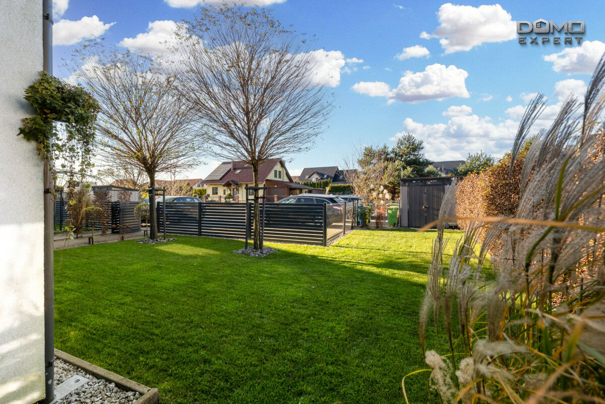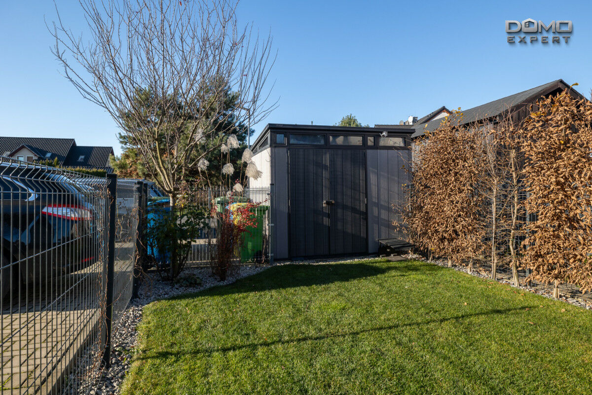 Do mieszkania przynależy ogródek o powierzchni 141,05 m², na którym znajduje się praktyczny domek gospodarczy, który zapewnia dodatkową przestrzeń do przechowywania.