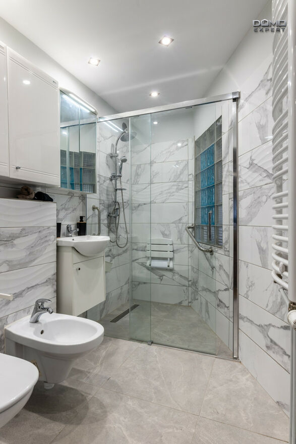 - łazienka z WC, prysznicem i pralką,