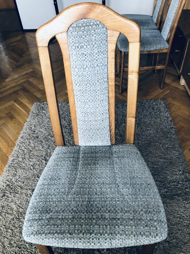 Trzy drewniane krzesła w dobrym stanie, nadające się do użytku w domu lub w biurze. Mają wygodne, tapicerowane siedziska w szarym kolorze, które dobrze pasują do różnych aranżacji wnętrz.Cena za sztukę - do negocjacji