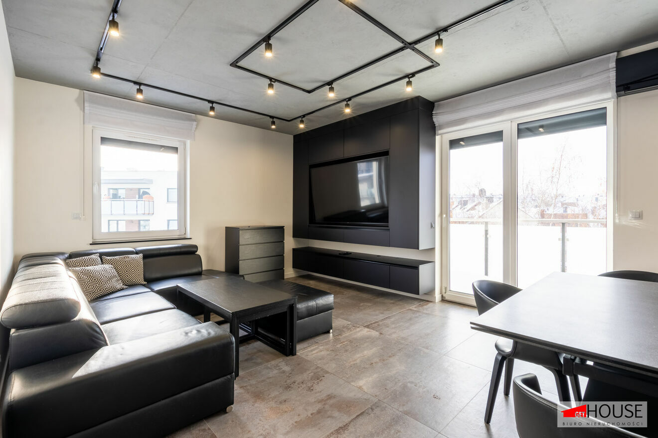 - nowoczesnego, w pełni wyposażonego salonu połączonego z kuchnią, jadalnią i wyjściem na duży balkon,