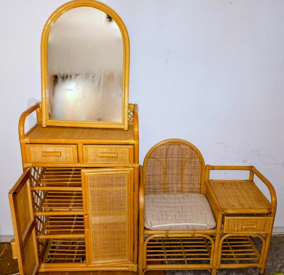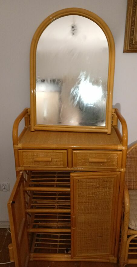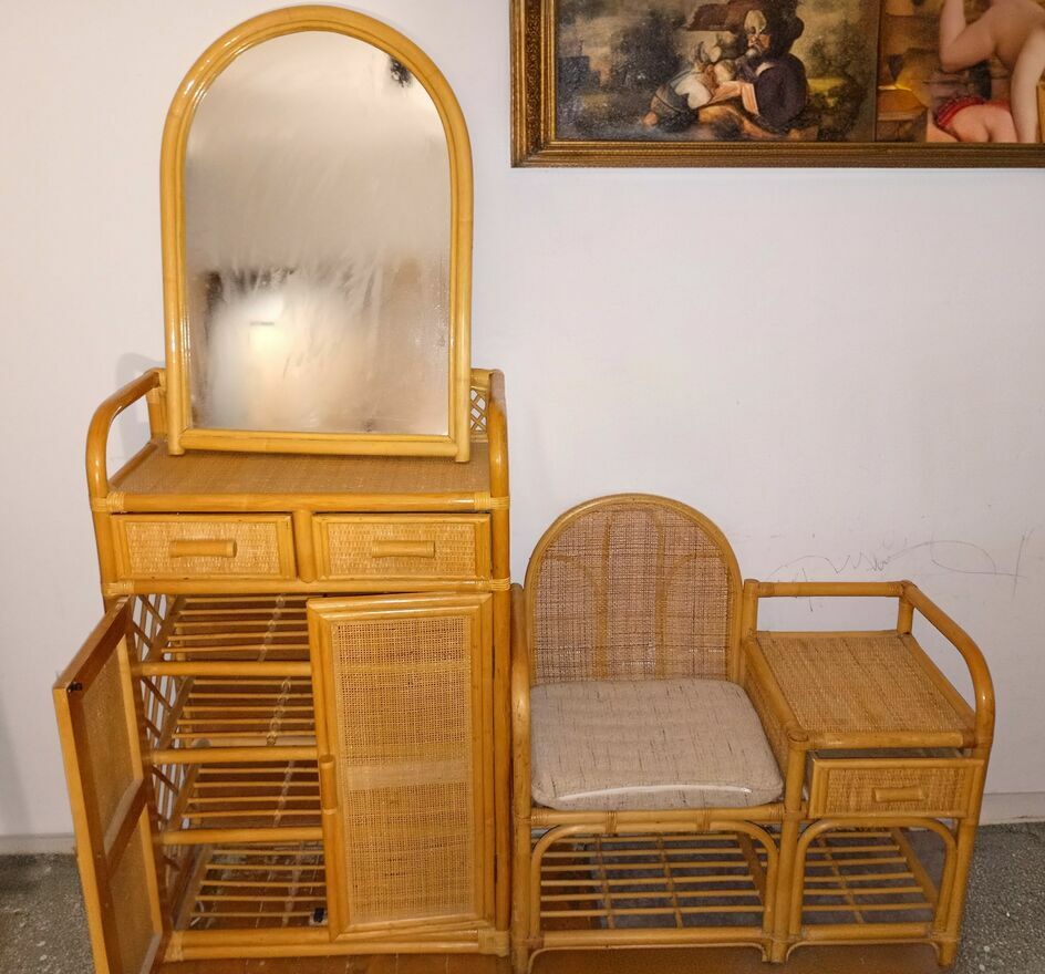 Elegancka komoda wykonana z rattanu i bambusa. Posiada lustro oraz praktyczne szuflady i półki, które zapewniają dodatkową przestrzeń do przechowywania. Meble z rattanu i bambusa to doskonały wybór do wnętrz w stylu boho lub rustykalnym, dodając ciepła i naturalnego charakteru. Dodatkowo jest jest żyrandol. Cena plus koszty wysyłki . Lub odbiór BolesławcuSprawdź zainteresowanie tym ogłoszeniem